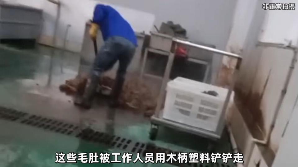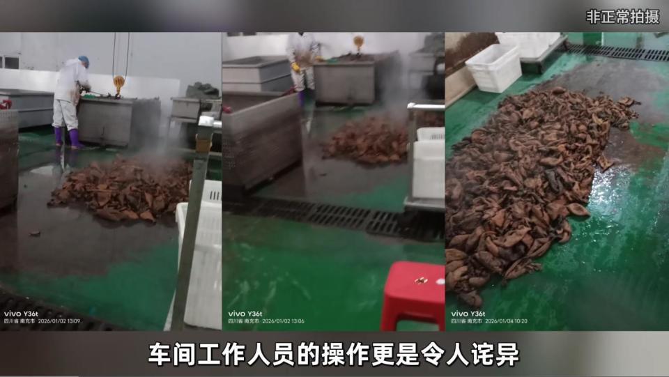 暗访镜头下的画面,堪比“食品安全恐怖片”。涉事工厂“四川川牛福食品有限公司”的车间里,工人一边蒸煮毛肚一边肆意抽烟,烟灰就这么直直落入食材;刚出锅的高温毛肚,被直接倾倒在破损积水、满是碎屑的脏污地面上冷却;更令人作呕的是,工人穿着同一双水靴,自如穿梭于厕所和加工车间,将严重的交叉污染风险直接“踩”进了产品里。