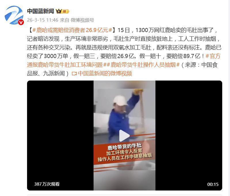 一边是工厂如此不堪的生产实况,另一边却是鹿哈直播间里信誓旦旦的“免洗免煮、假一赔十”的承诺。巨大的反差,如今正化作一柄沉重的达摩克利斯之剑。数据显示,该产品单平台销量已近3000万单,单价约29.9元。若按直播间“假一赔三”的承诺,赔付金额将高达26.9亿元;而若依据《食品安全法》的“退一赔十”标准,这个数字将飙升至令人瞠目的89.7亿元。网传“3000万单”为鹿哈抖音橱窗全品类历史总销量,涉事毛肚具体销量仍需以官方通报为准。