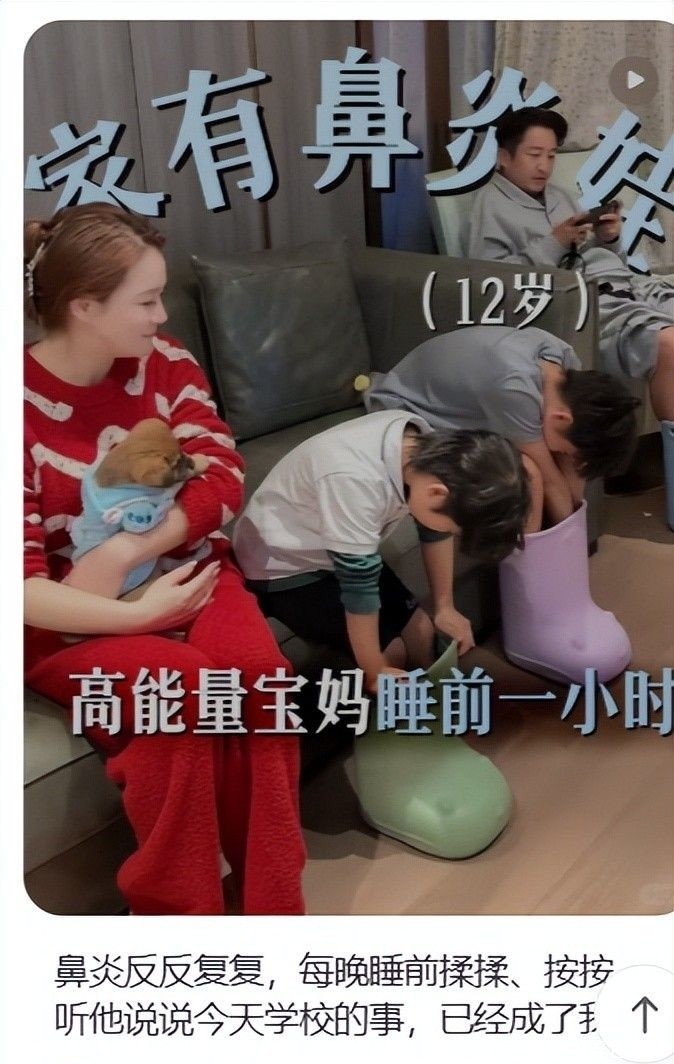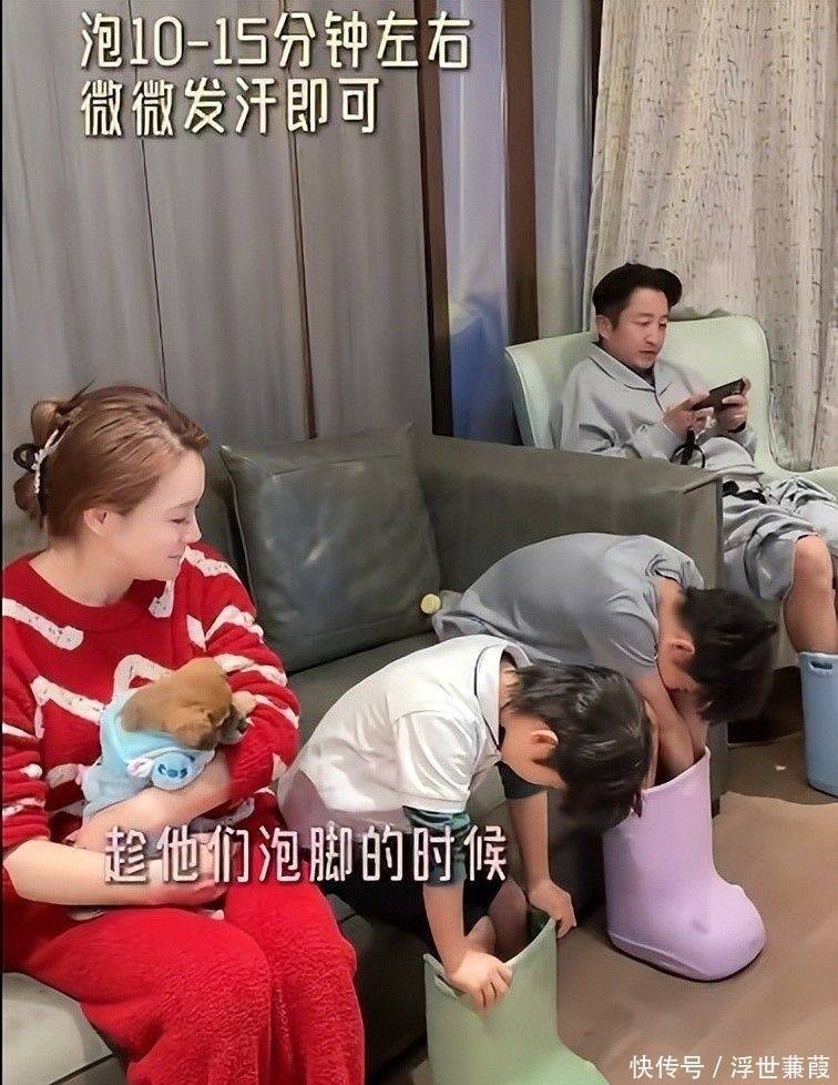 视频里,她身着素净棉麻家居服,乌黑长发松松挽成低髻,眉眼舒展,笑意柔和。为每个孩子揉捏脚底时,不忘轻声细问:“这样按着舒服吗?”轮到邹市明时,还顺手将提前备好的草本足浴包递至他手边。